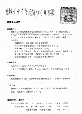 健康づくり市民推進委員等の地域住民が中心となり、住み慣れた地域で子供から高齢者までの市民同士の交流を通じて、健康的に、生きがいを持って、イキイキと活動的に暮らすことができるよう支援する事業です。